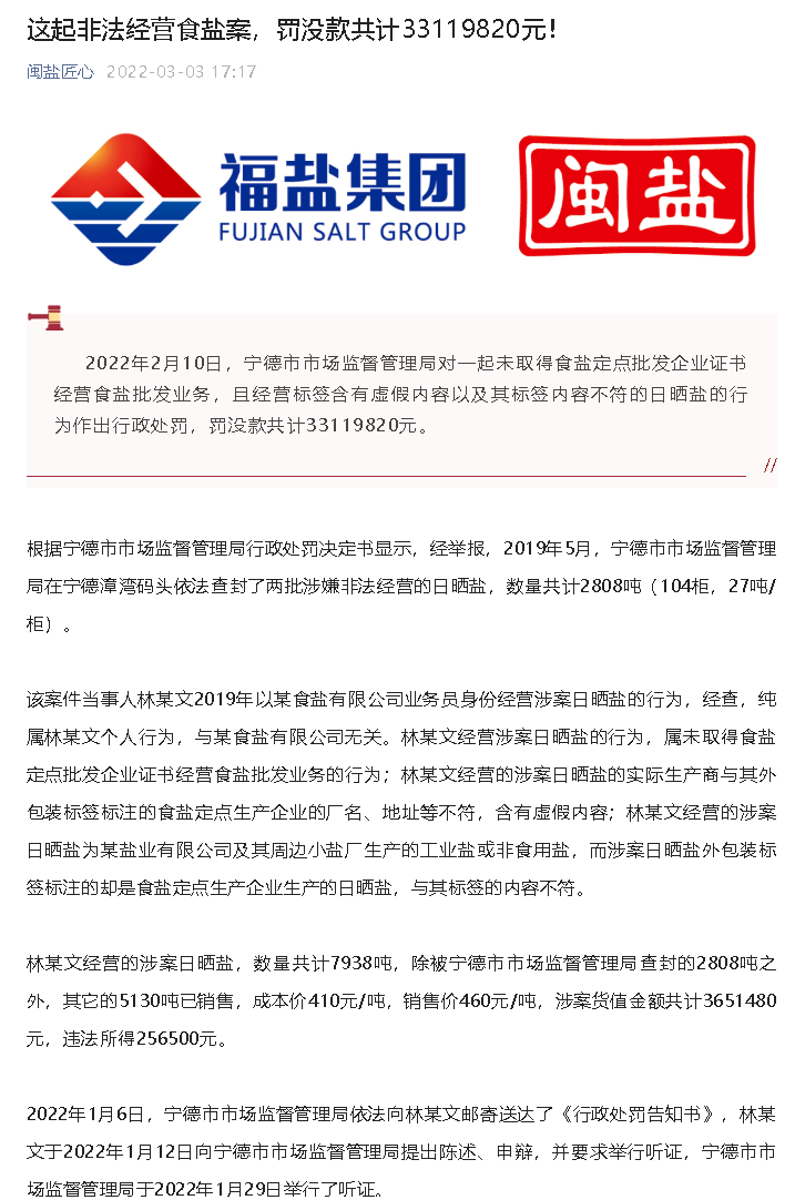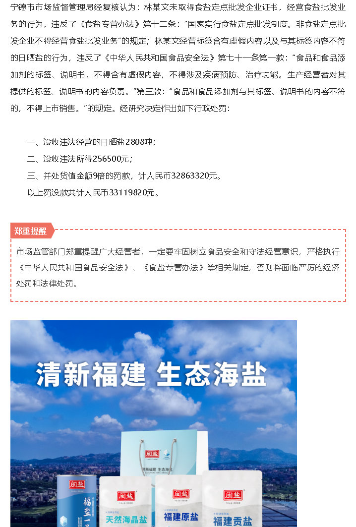 2022年2月10日,宁德市市场监督管理局对一起未取得食盐定点批发企业证书经营食盐批发业务,且经营标签含有虚假内容以及其标签内容不符的日晒盐的行为作出行政处罚,罚没款共计33119820元。