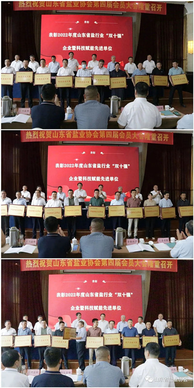 会上还对2022年度盐行业“双十强”企业和科技赋能先进单位进行了表彰,为新一届副会长单位、常务理事、理事单位和会员单位颁授了铜牌和证书。