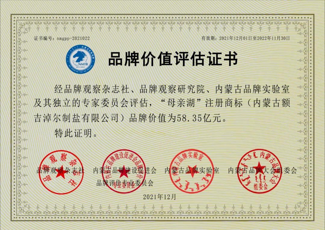 大会开幕式上发布了“2021年度内蒙古品牌价值评价信息数据”和“2021年度内蒙古百强品牌价值评价分析报告”;并向获得2021年度内蒙古百强(优秀)品牌企业代表颁发牌匾、证书。蒙盐集团“母亲湖”品牌以58.35亿元价值荣获“2021内蒙古百强品牌”,在总榜单中排名第22位。同时,蒙盐集团额吉淖尔制盐有限公司被评为“2021内蒙古品牌建设标杆企业”。
